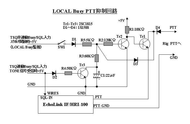 Busy時のPTT OFF機能を無効にする為のものです。 D3/D4はBusy監視をノード無線機とは違う別のモニター用無線機で行う場合に必要なもので、ノード用無線機自体でBusy監視を行う場合、D3/D4/R5は省略しても結構です。本回路はただ単にトーンの入ってない局が出てる場合にInterNet側からの送信起動時にPTT抑制するもので、その間にInterNet側から来た音声は電波として出ません。又、当然の事ですがノード無線機が一旦送信動作に入ると途中ではPTT