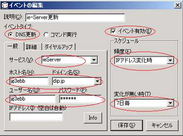 [DNS更新] [イベント有効] が選択されている事を確認。 サービス(V)は ieServer を下矢印で選択します。 ホスト名(V)は登録したユーザ名を入力、ドメイン名(S)は登録したドメイン名を下矢印で選択します。 ユーザ名(U)、パスワード(P)も登録したものを入力します。 <参考> [Info]を押せばサービス毎の設定補足説明が表示されます。 頻度(F)は[IPアドレス変化時]、変化が無い時(T)は[7日毎]を選択します。 [保存]で設定を保存します。 |