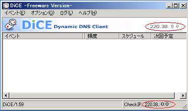 DiCEを起動すると左記の画面になり、赤丸で囲んだ部分にグローバルIPアドレスが表示されます。