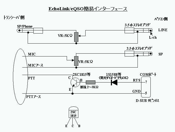 | EchoLink/eQSO用簡易インターフェースです。回り込み、ノイズ防止の為トランスを入れPCとRigを分離したほうが良いと思います。10wのLowPower運用ではトランスを入れなくても問題は発生していません。短時間ですが50w試験運用にても問題無しでした。しかし設置環境、運用周波数(特にローバンド)等でトラブル発生の可能性があるかも知れません。 出来ればPCとRig間にST-71(600Ω:600Ω)を入れると共に、PTT駆動はフォトカプラを使用してPCとRigを分離して頂いた方が良いと思います。一番上のボリュームはリグ側で出力調整可能であれば抵抗入りケーブル利用等により省略してもかまいません。 アルインコ製無線機等リグのMIC端子に+電圧が供給されている場合、リグMIC端子とボリュームセンタ間に10μF程度のコンデンサを入れてください。(極性はリグ側が+です) リグにVOXが有る場合はPTT制御回路は省略できますので非常に簡単に出来ると思います。(VOXのバタつき防止の為、リグのVOX-GAINを上げ気味でDELAY時間を少し長く取るほうが良いと考えます) ハンディ機用(ICOM/YAESU社製)の場合は下図をご参考願います。 PTTラインの抵抗R1は推奨値ですがヤエス用2〜3KΩでアイコム機でも問題なく使用出来ました。 ヤエスVX-5/FT-1D等、4極タイプのハンディ機をマイク変換コネクタ(CT-44等)で使用する場合、R1の抵抗は1KΩ以下(800Ωオーム程度)にして下さい。 |