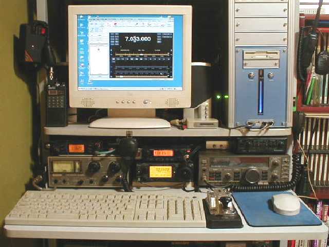 FMV−LOOX 無線LANで接続、家のどこからでもネット接続OK Web/FTP/eQSOサーバ、EchoLink用PCのリモート監視 eQSOクライアント、HAMLOG FT−817(写真左上) シャックと離れたテーブル上に通常セット 3D-FB同軸引き回しにてHL-50Bリニアに接続 移動運用時に持ち出し SSTV/eQSOリンク用にも時々使用 (PCとFT-817間の箱が自作のVox式インターフェース) |
